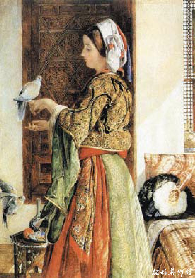 《少女》作者:约翰·弗雷德里克·刘易斯(英国)作者通过对衣裙细腻而深入的刻画将少女优雅高贵的气质表现出来。上身装束繁琐的纹饰处理,既刻画出绸缎的质地又将人物的体量感表现得真实而贴切,足见刘易斯高超的表现技巧。